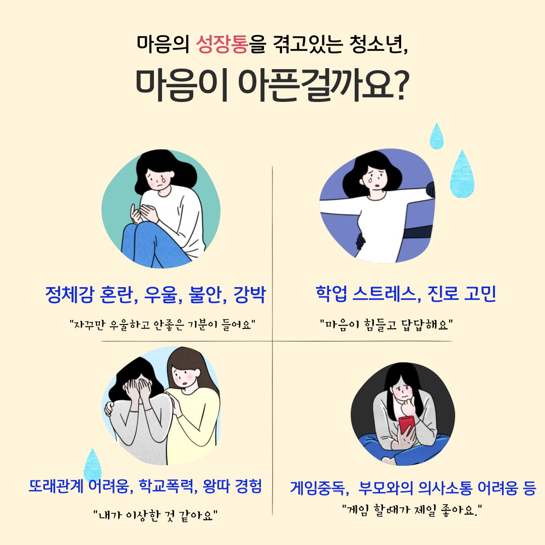 이처럼 청소년기는 다양한 마음의 성장통을 겪을 수 있으며, 이를 건강하게 극복하지 못하면 나아가서 성인기까지 부정적인 영향을 미칠 수 있습니다.