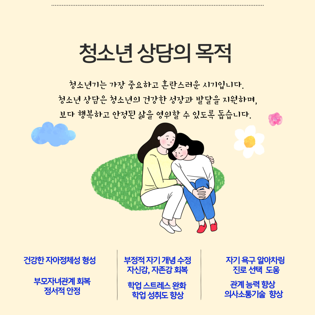 상담은 청소년이 자신을 더 잘 이해하고, 자신의 가치와 목표를 명확하게 설정하는 데 도움을 줍니다.